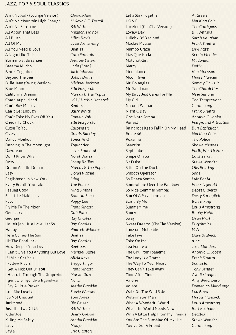 Unser Repertoire umfasst Pop, Soul und Partyklassiker, aktuelle Titel und eigene Interpretationen von diversen Hits.